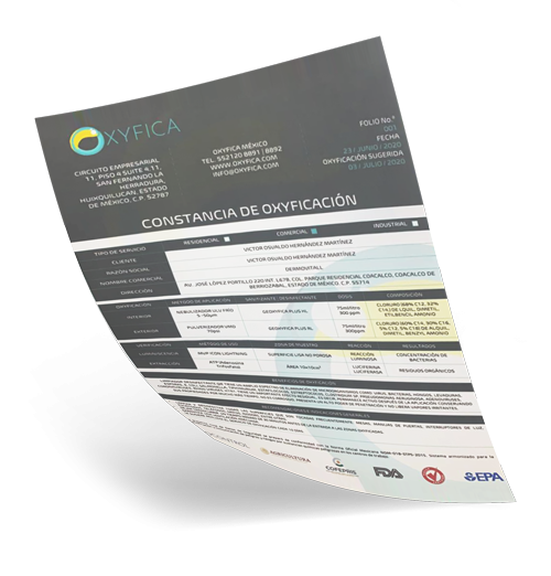En Oxyfica, tras finalizar cada Servicio de Biodesinfección, otorgamos un certificado detalla con exactitud sobre procesos y productos que se han empleado, que zona se desinfectado y la fecha de la actuación, cumpliendo con todos los requisitos exigidos por Control Sanitario, garantizando que se han empleado productos desinfectantes seguros, eficaces, avalados y recomendados por la OMS, FDA, EPA, NSF y HACCP.